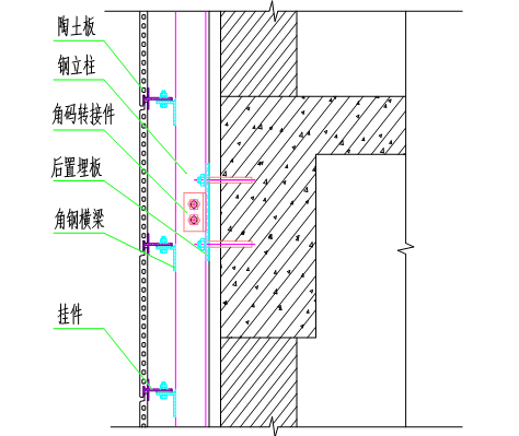 干掛陶土板幕墻施工技術是預先運用CAD軟件繪制排版分格圖,工廠機械化加工裁切成型,采用鋼龍骨掛件式安裝系統;施工現場在主體結構上安裝后置埋件,通過角碼專家將豎向龍骨與埋件連接固定,采用焊接連接將角鋼橫梁固定在豎向龍骨上,再通過掛件把陶土板固定在橫梁上,掛件與橫梁之間采用柔性絕緣墊片隔開,掛件與陶土板之間打耐候膠固定。